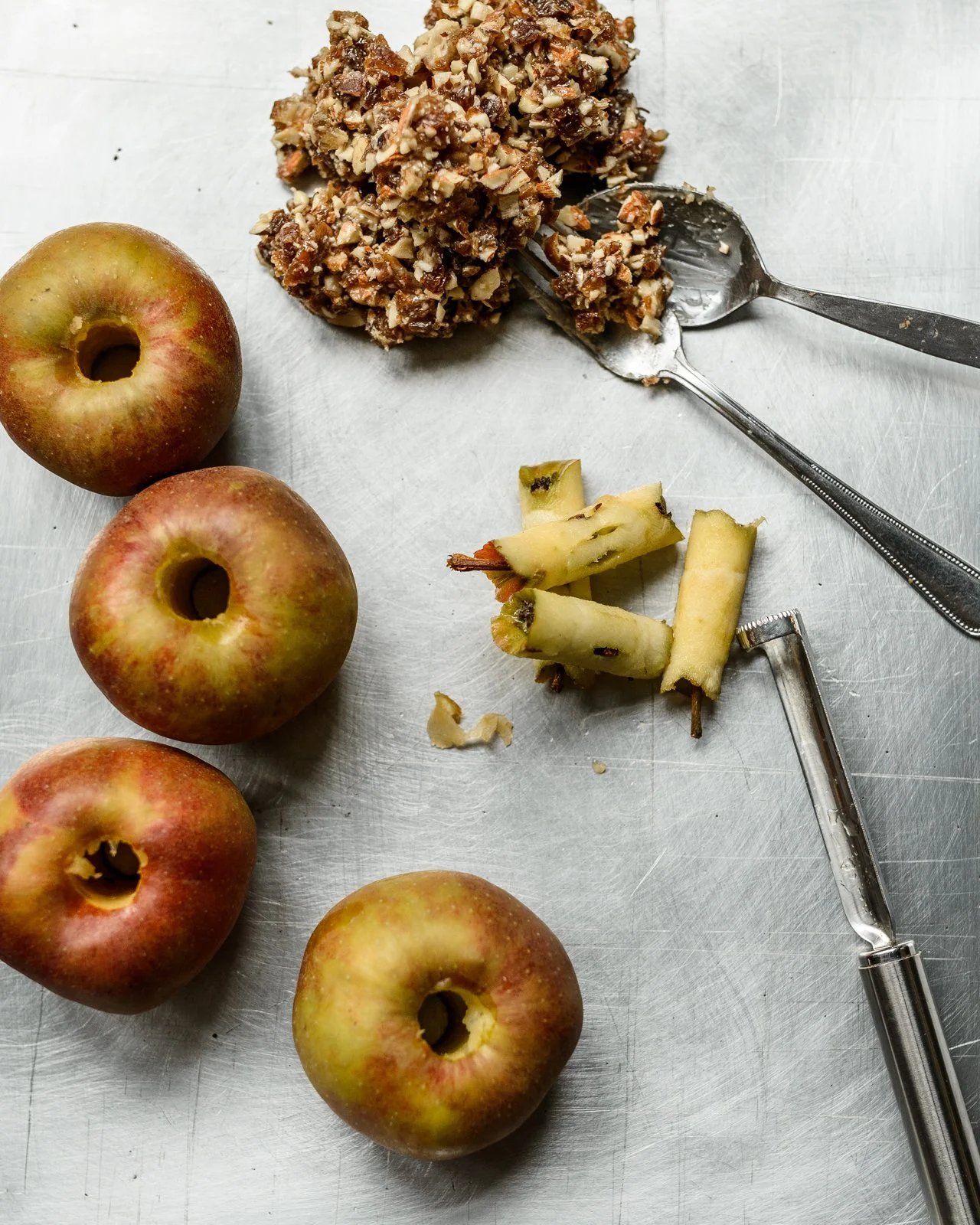 Die Füllung feste in die Löcher drücken, darauf achten, dass die Äpfel nicht brechen