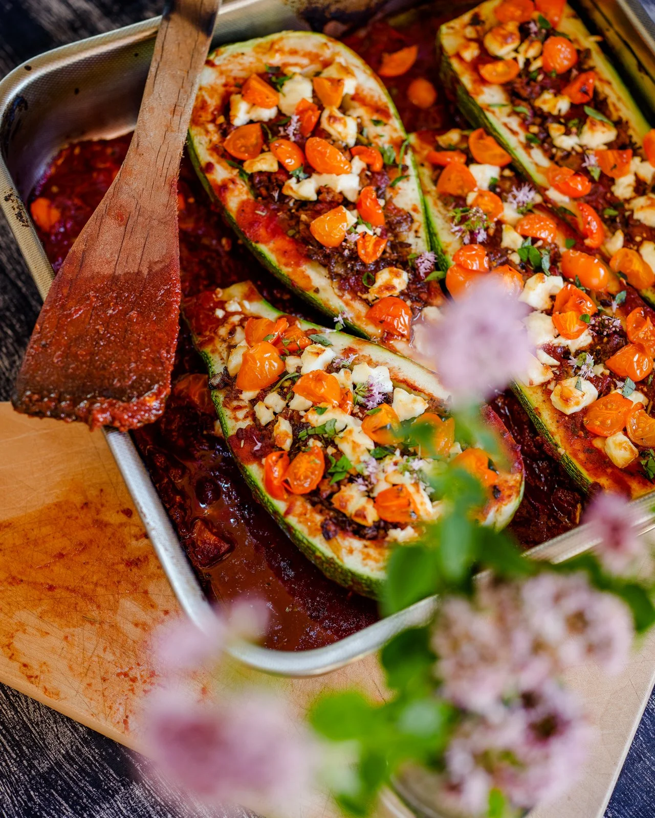 Bei 180 Grad Ober- Unterhitze für ca. 25 Minuten in den Backofen, bis die Zucchini weich sind