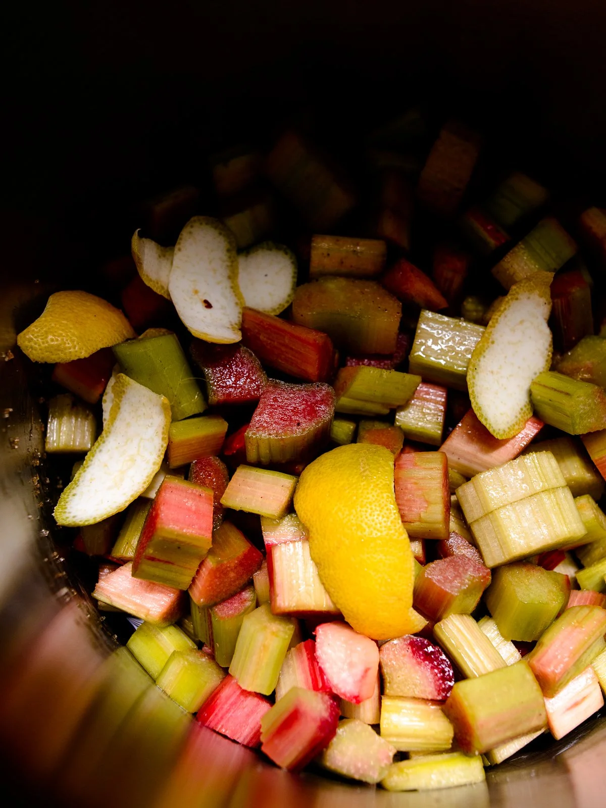 Rhabarber entblättern, schälen und in ca. 3 cm große Stücke schneiden