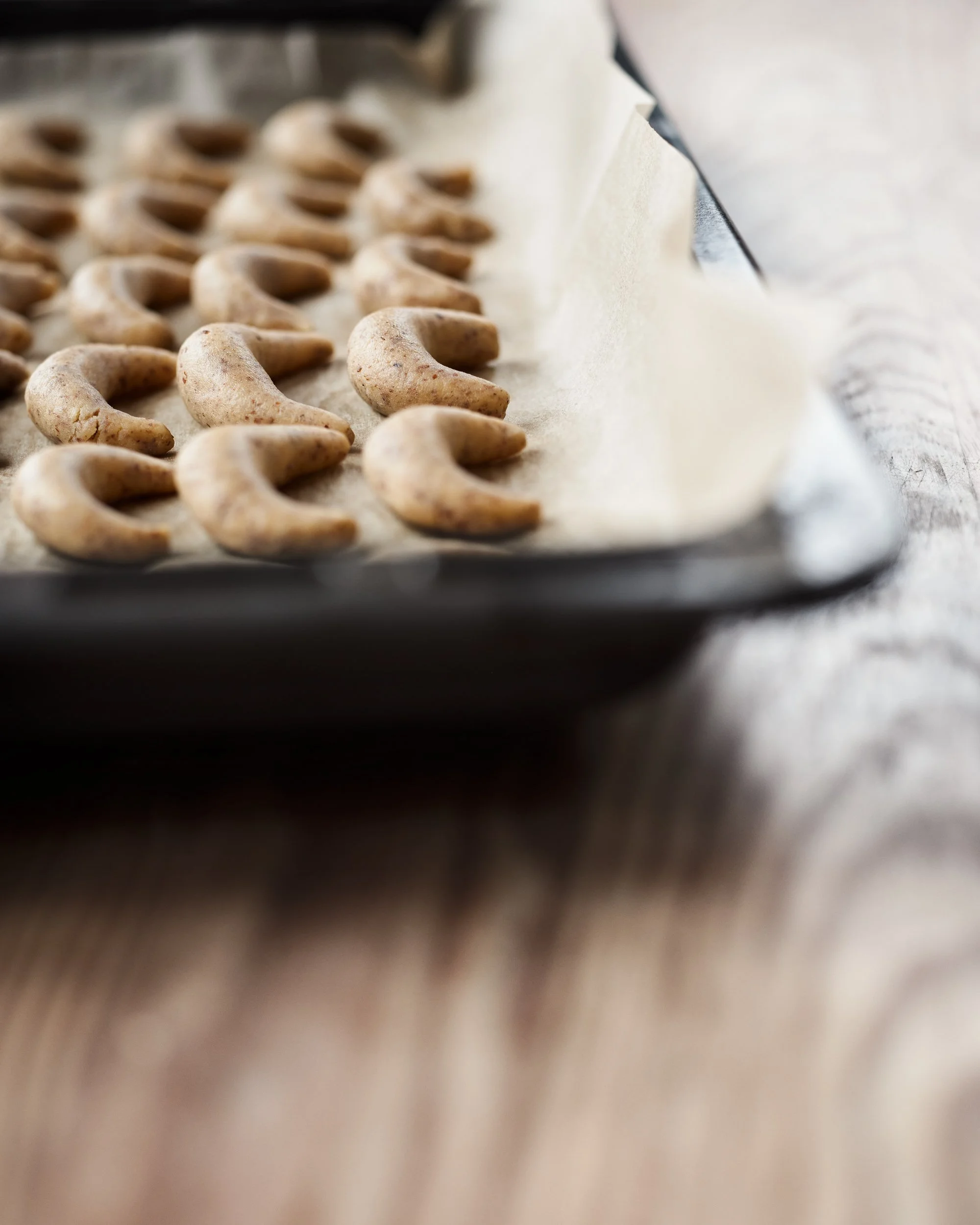 2 Bleche mit Backpapier auslegen, die Teigrollen in gleichmäßige Querscheiben schneiden und daraus kleine Röllchen fertigen, aus denen die Kipferl gebogen werden