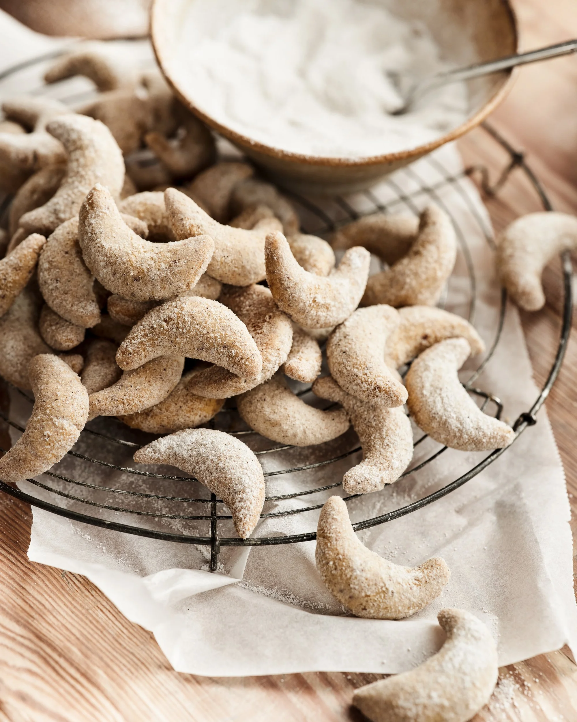 Die noch heißen Vanillekipferl im Zuckerbad wenden und auf einem Gitter abkühlen lassen